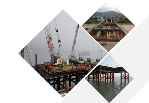 • 常見的施工平臺主要形式有:單棧橋平臺、雙棧橋平臺、利用鋼護筒導(dǎo)向和承載的平臺、利用圍堰或筑島承載的平臺、移動式平臺、水中整體吊裝平臺